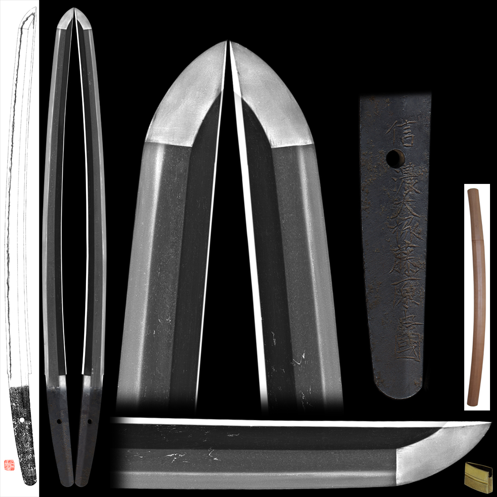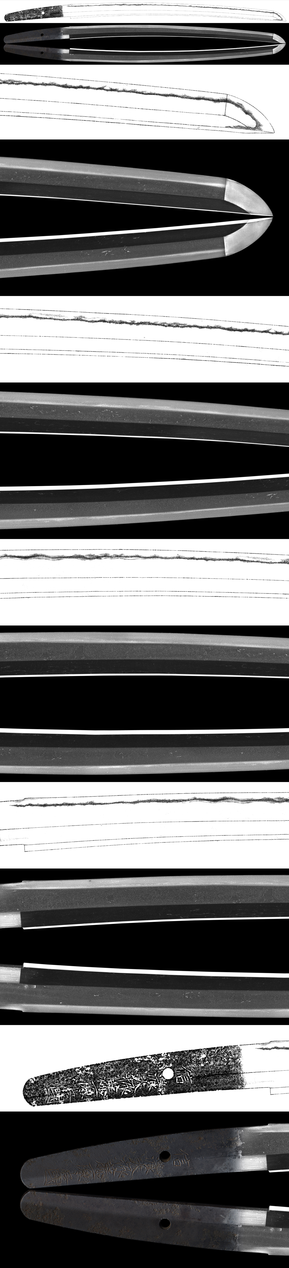 Special feature : Shinano Daijyo Fujiwara Tadakuni is said to be the student of Dewadaijyou Kunimichi. This piece is second generation piece. It is tight suguha base with some koashi seen. It is fine piece.
