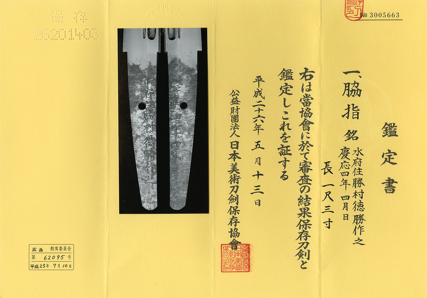 Wakizashi : Suifu Ju Katsumura Tokkatsu sakuno/Keio 4 Nen 4 Gatsu Hi.