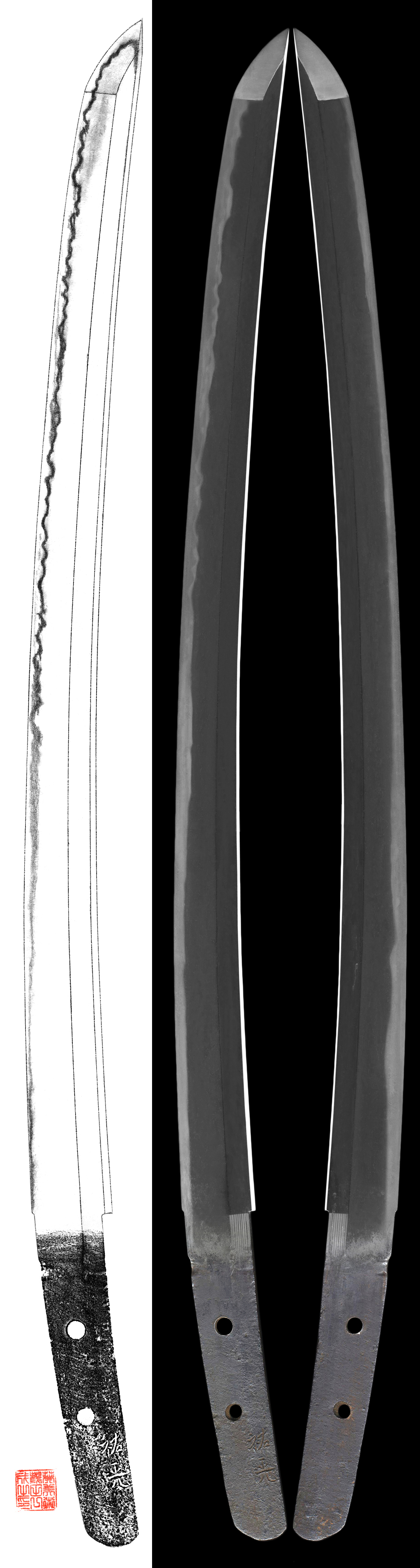Hamon : Nioideki, Gunome Choji midare hamon. And also slightly Utsuri appear.