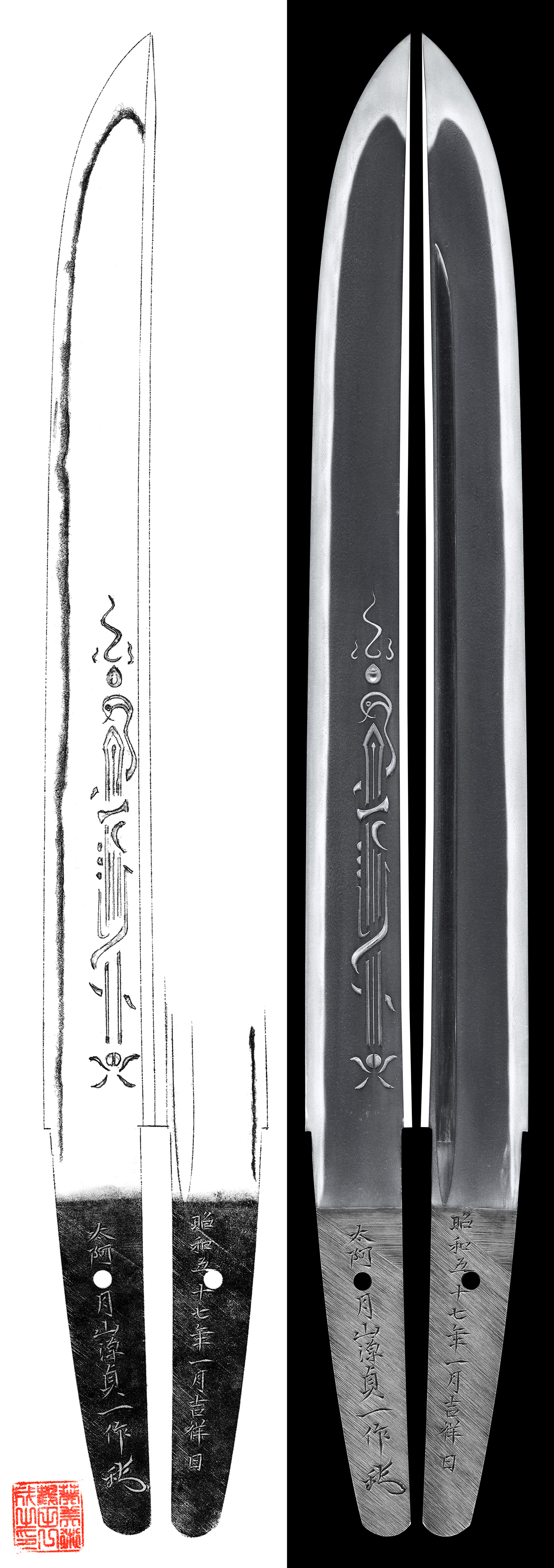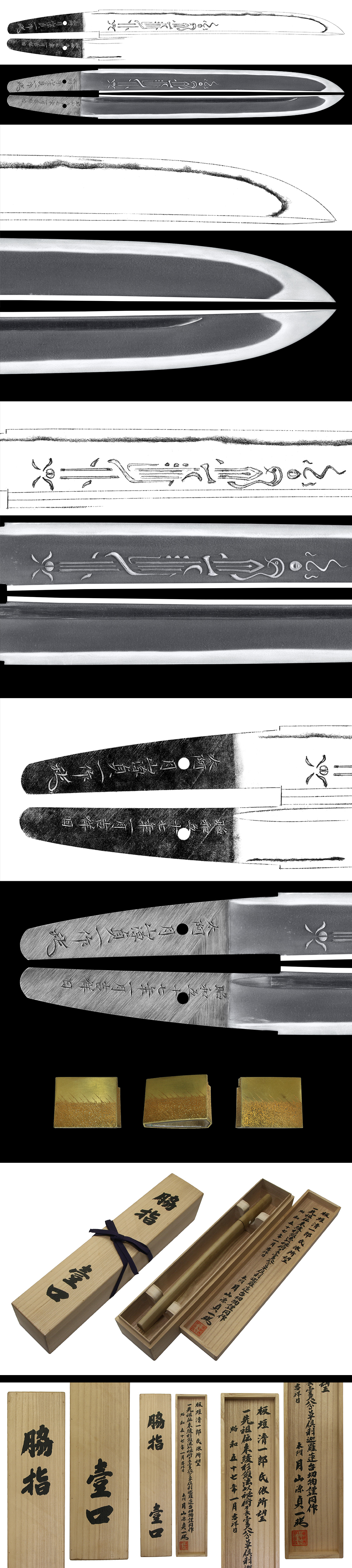 Shape : Wide and thick blade Hirazukuri style with Kurikara sword and Bohi engraved on each sides of the blade.