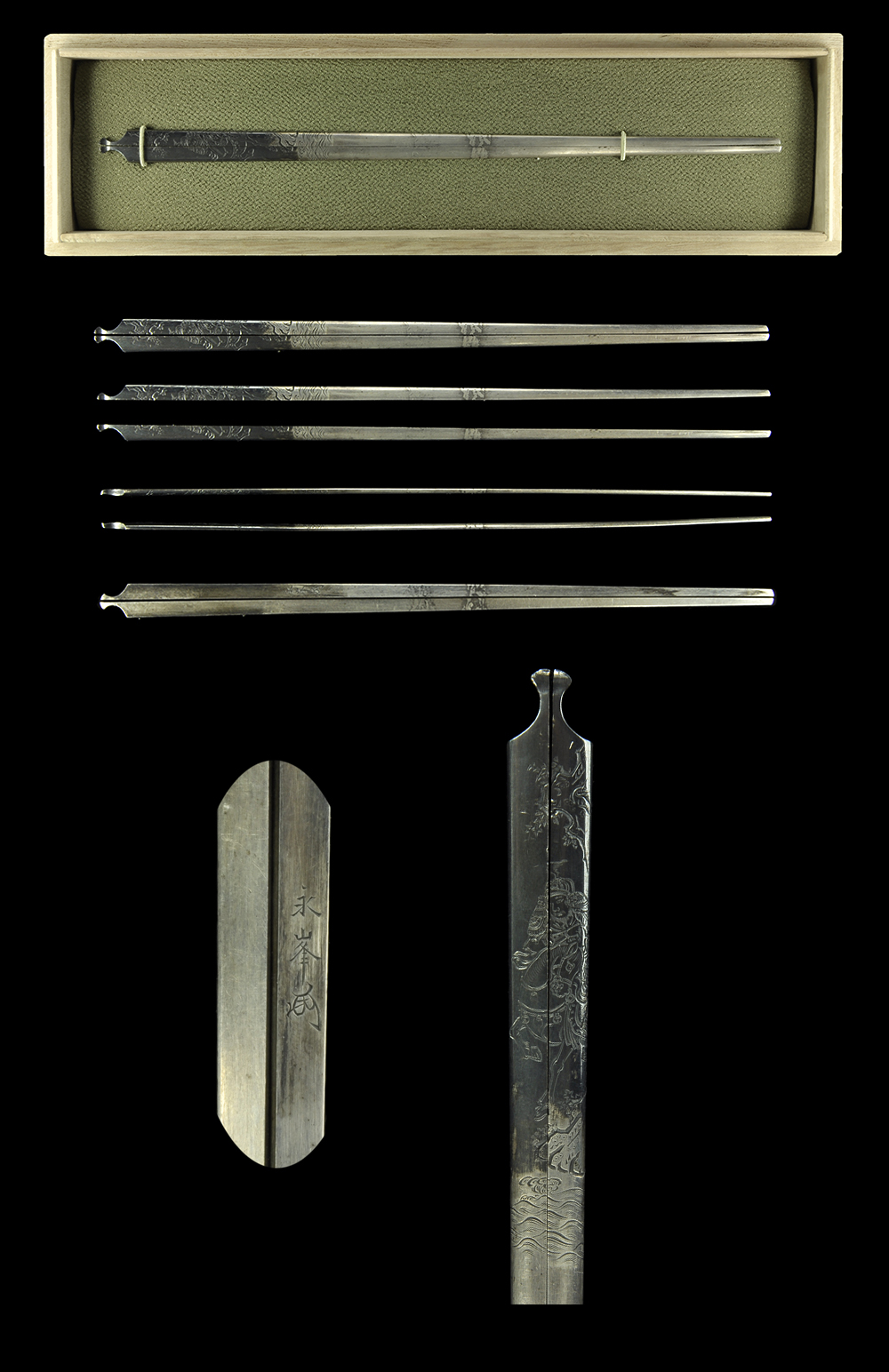 Wari-Kogai : Mei (signature) : Mumei(Unsigned) Length : 17.57 cm x 1.05 cm ( 6.91 inches x 0.41 inches) Jidai(era) : Edo Period Special feature : Iron, dragonfly is engraved with gold color. AOI estimation paper In Kiri box. Price ...