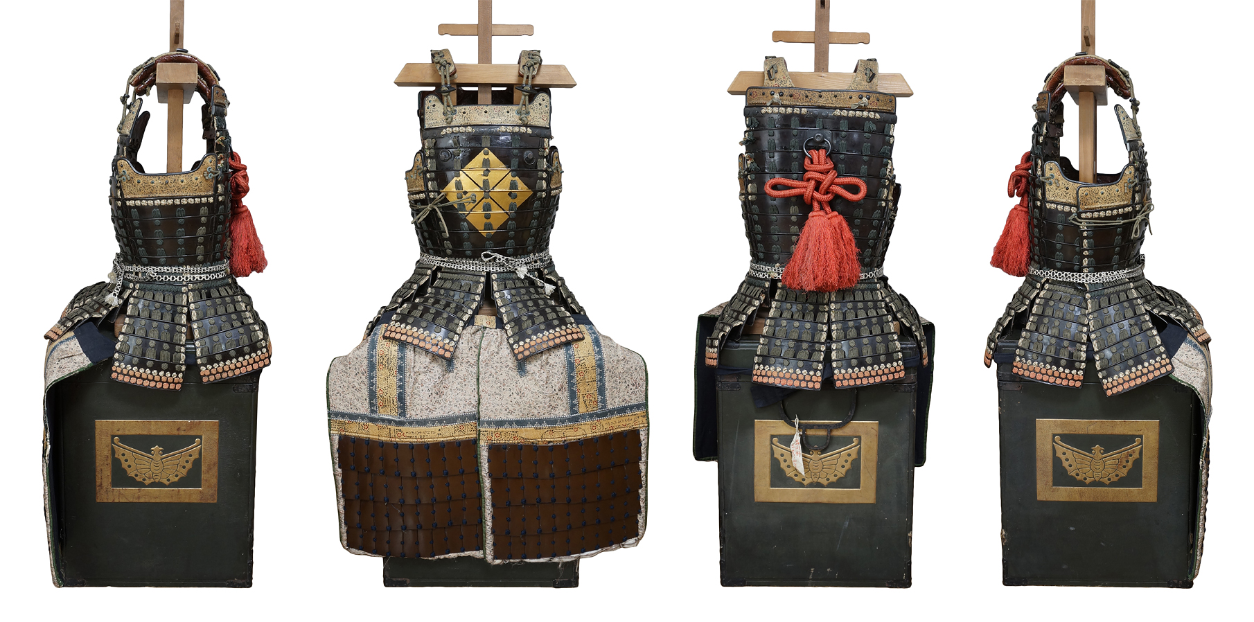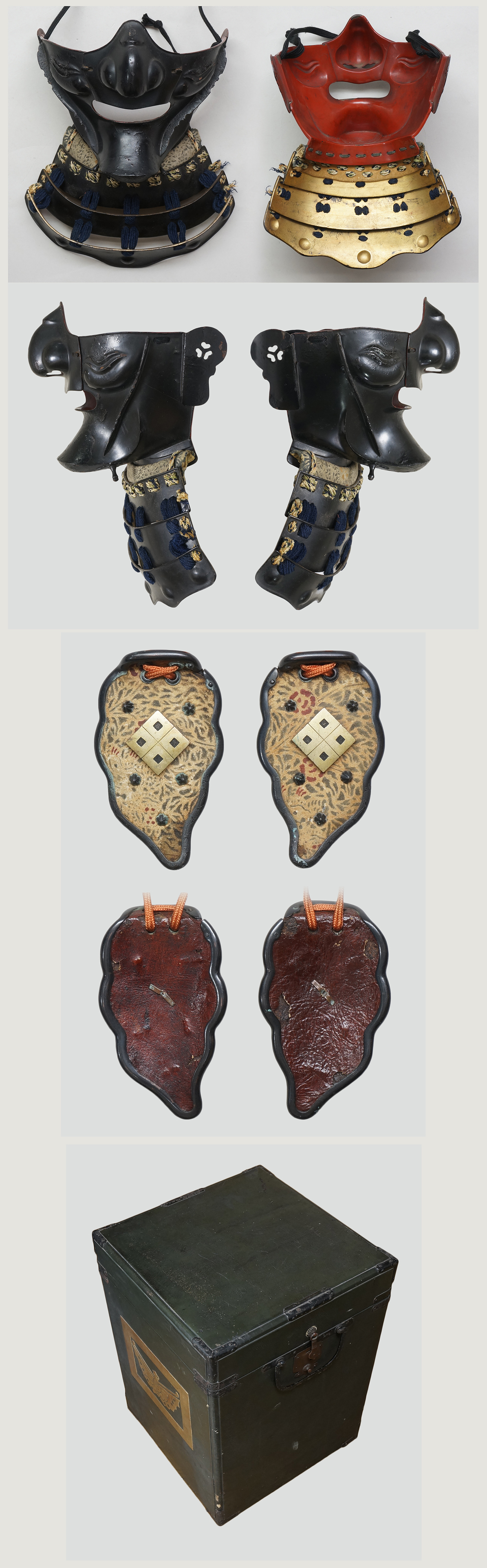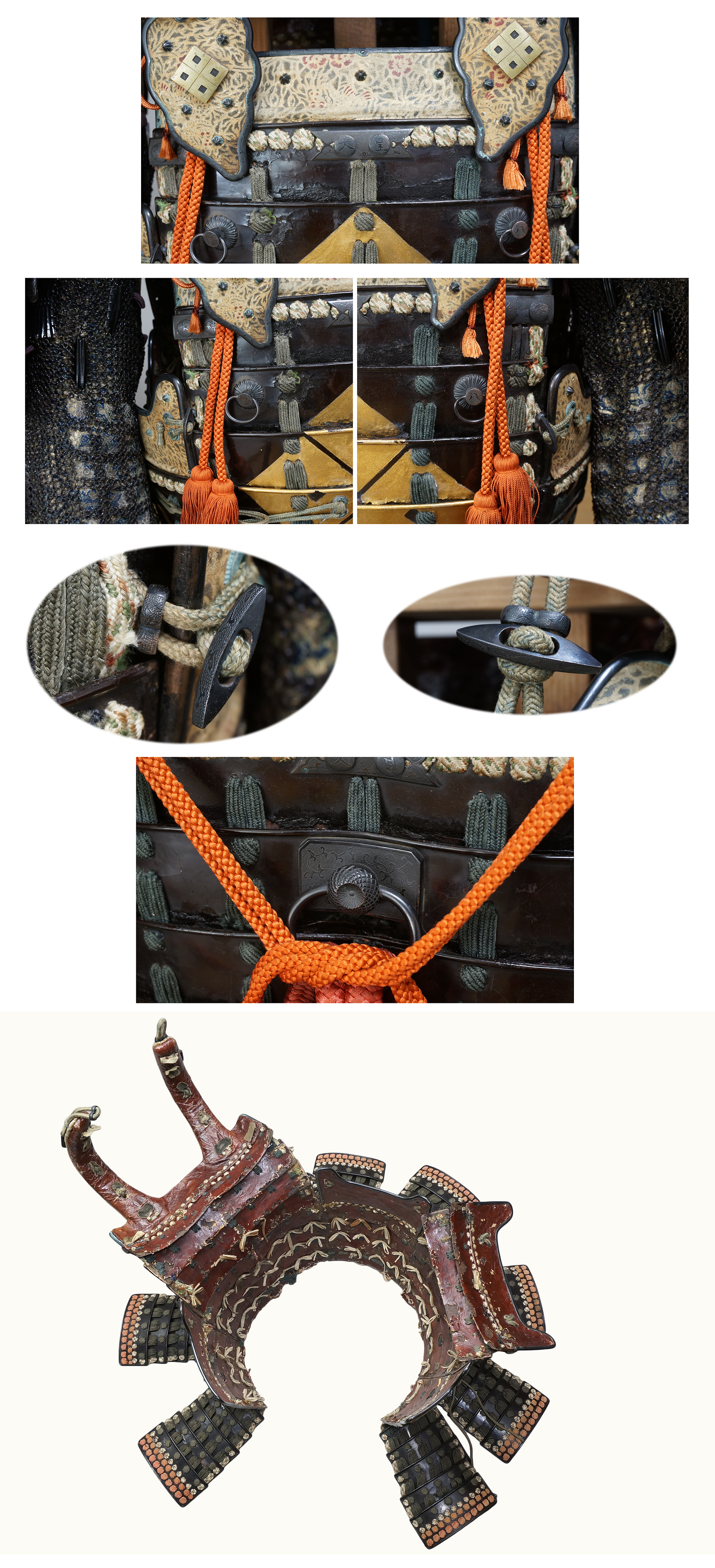 Yoroi and Kabuto (Armor) peach style Kabuto. Mei (signature) : Mumei(unsigned) Jidai(era) : Middle Edo period. Special feature : Iron do(iron 7 plates) and large Maetate unusual shape. The body is covered by Jinbaori. Menpo : Inside of the Menpo ...
